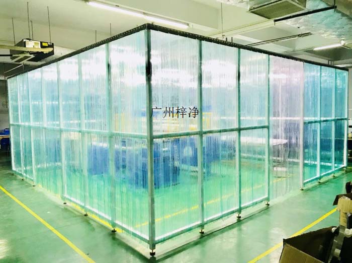 潔凈棚采用工業鋁材(或不銹鋼方通、鐵方通噴塑)作為框架,風機濾網機組(FFU)送風,四周懸掛防靜電垂簾(或鋼化玻璃),其內部凈化級別可達到100-10000級。適用于操作區內局部凈化級別要求高的區域。